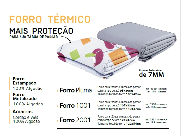 Os modelos estampados 100% algodão ajudam a refletir o calor, proporcionando maior eficiência na tarefa e um charme extra com suas lindas estampas. A espuma de poliuretano com 7 mm de espessura e densidade D16 proporciona maciez e conforto superiores, tornando o momento de passar roupas mais agradável.