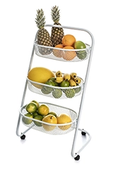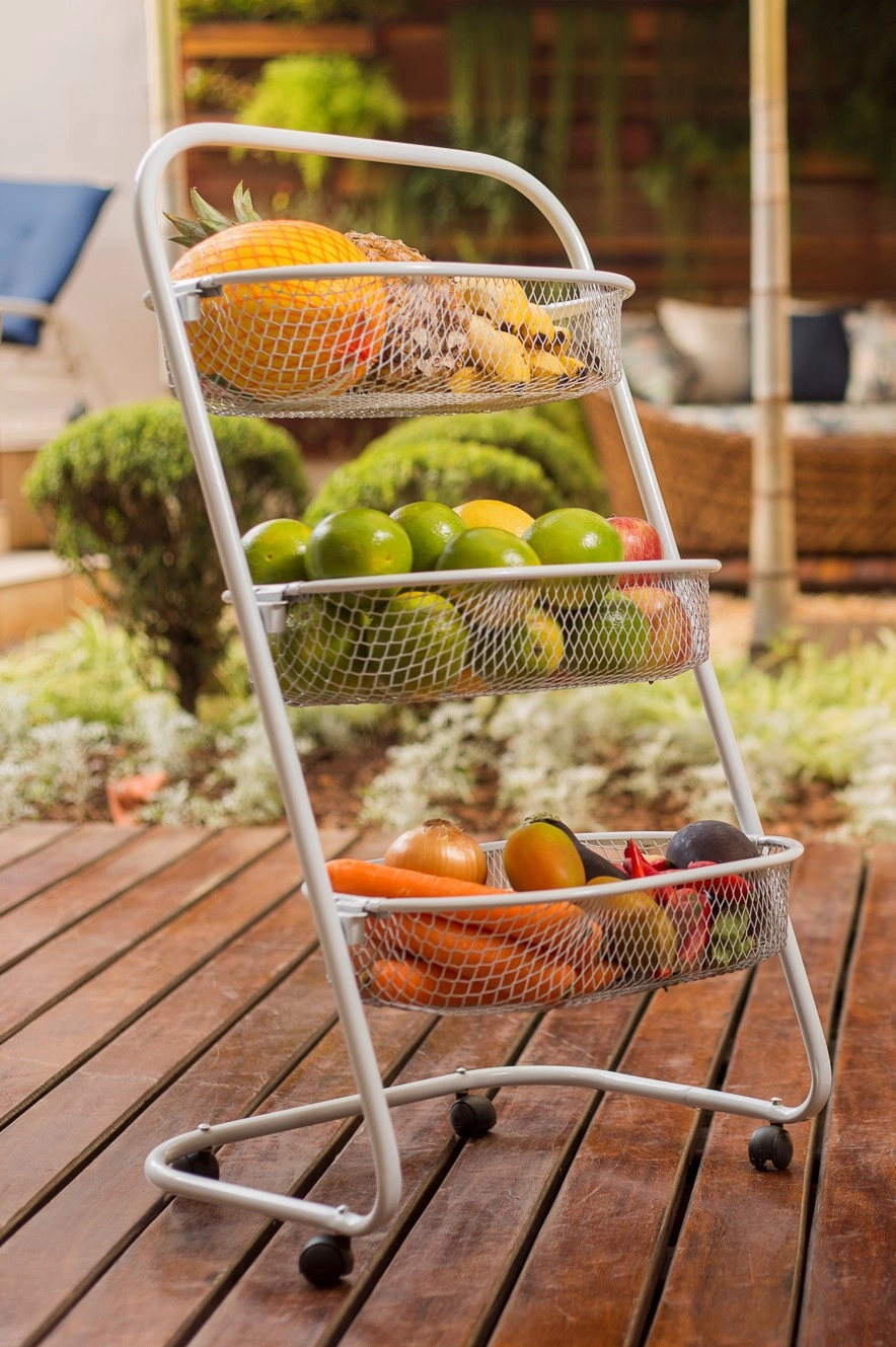 Fabricada em aço carbono 5/8” com acabamento em pintura epóxi eletrostática, a fruteira é resistente a riscos, ferrugem e extremamente durável. Seus cestos em chapa de aço expandida suportam até 5 kg cada e podem ser removidos, facilitando o uso, transporte e limpeza.