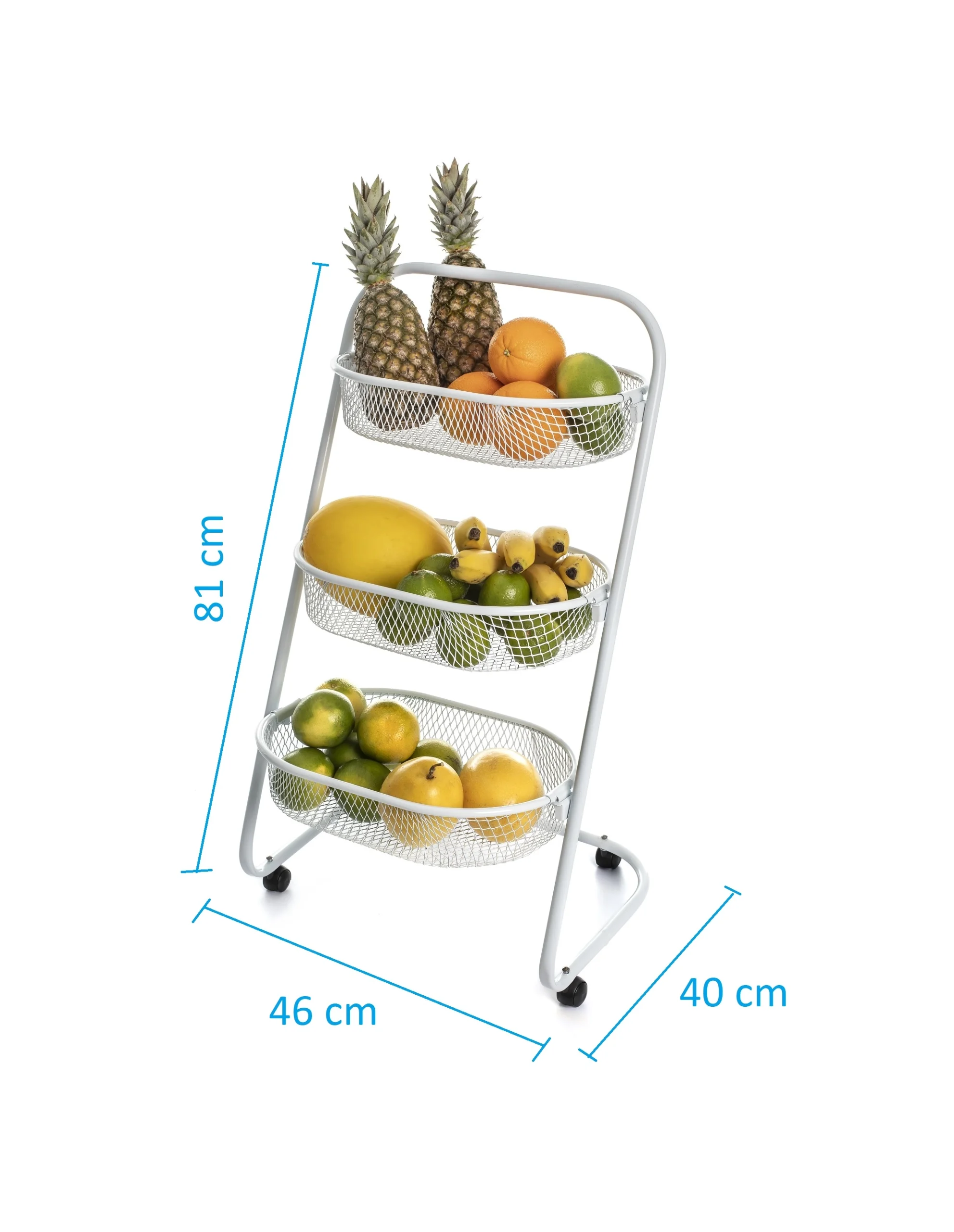 O produto conta com rodízios de polipropileno, garantindo fácil locomoção entre os ambientes. Com design compacto e elegante na cor branca, ele se encaixa perfeitamente em qualquer espaço, mantendo tudo organizado e ao alcance. As dimensões da fruteira montada são 81 x 47 x 42 cm.