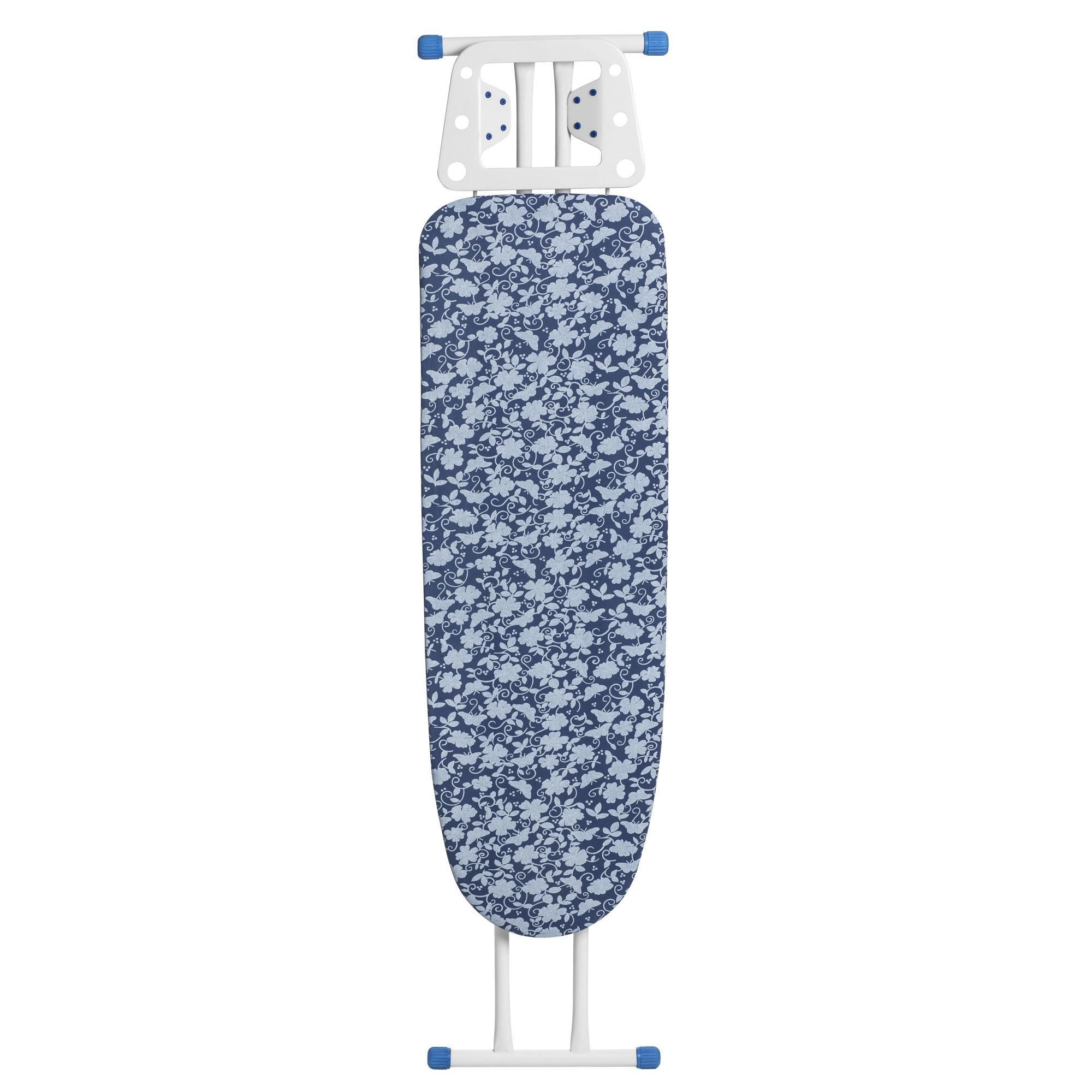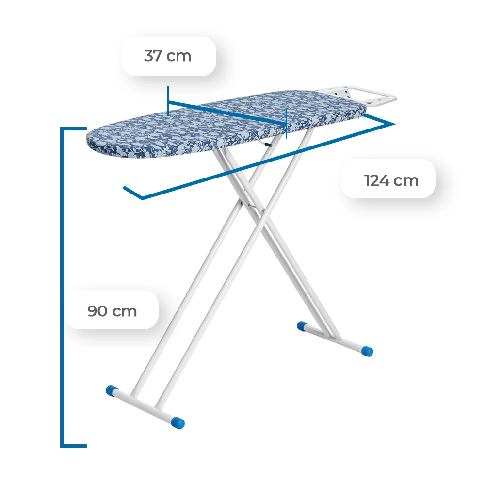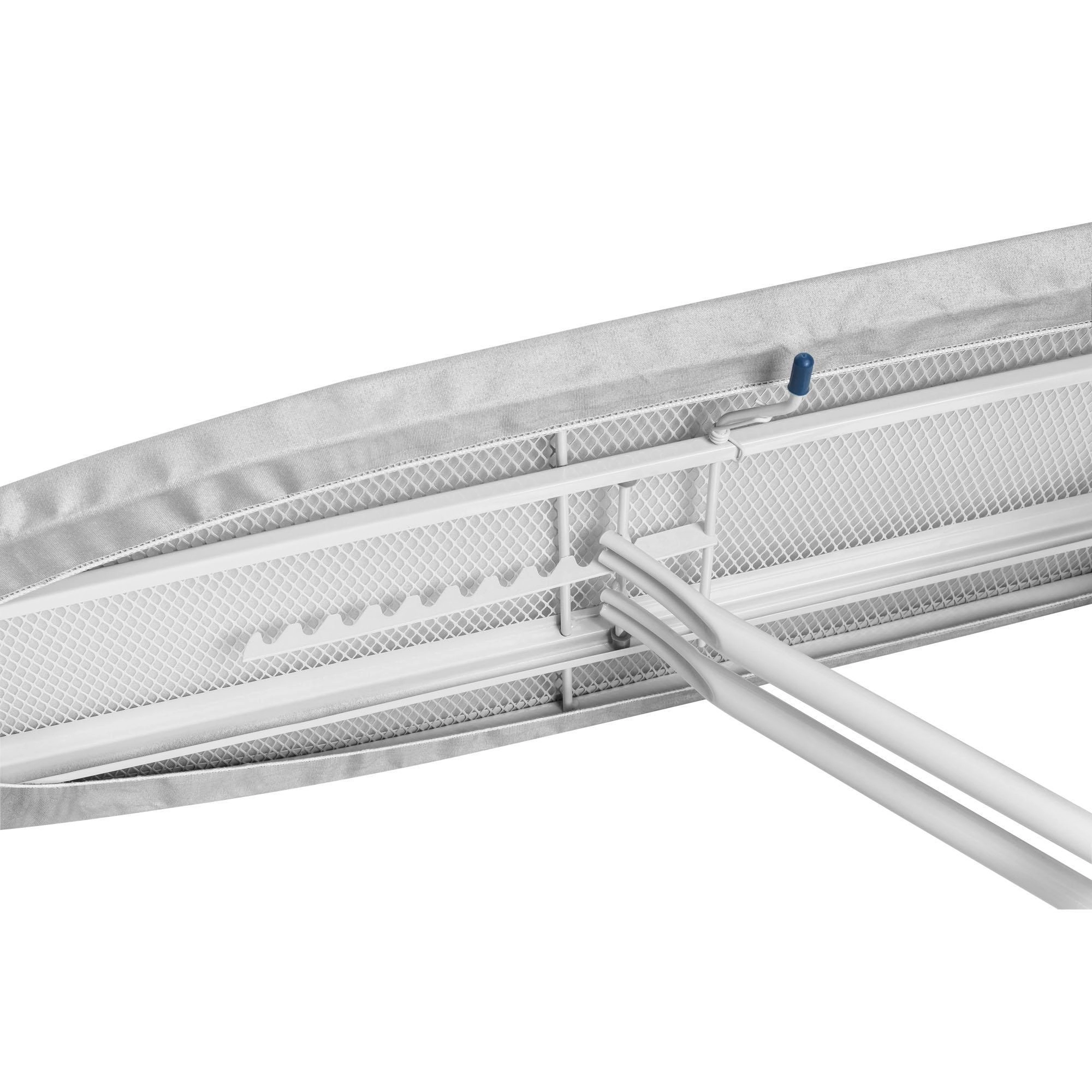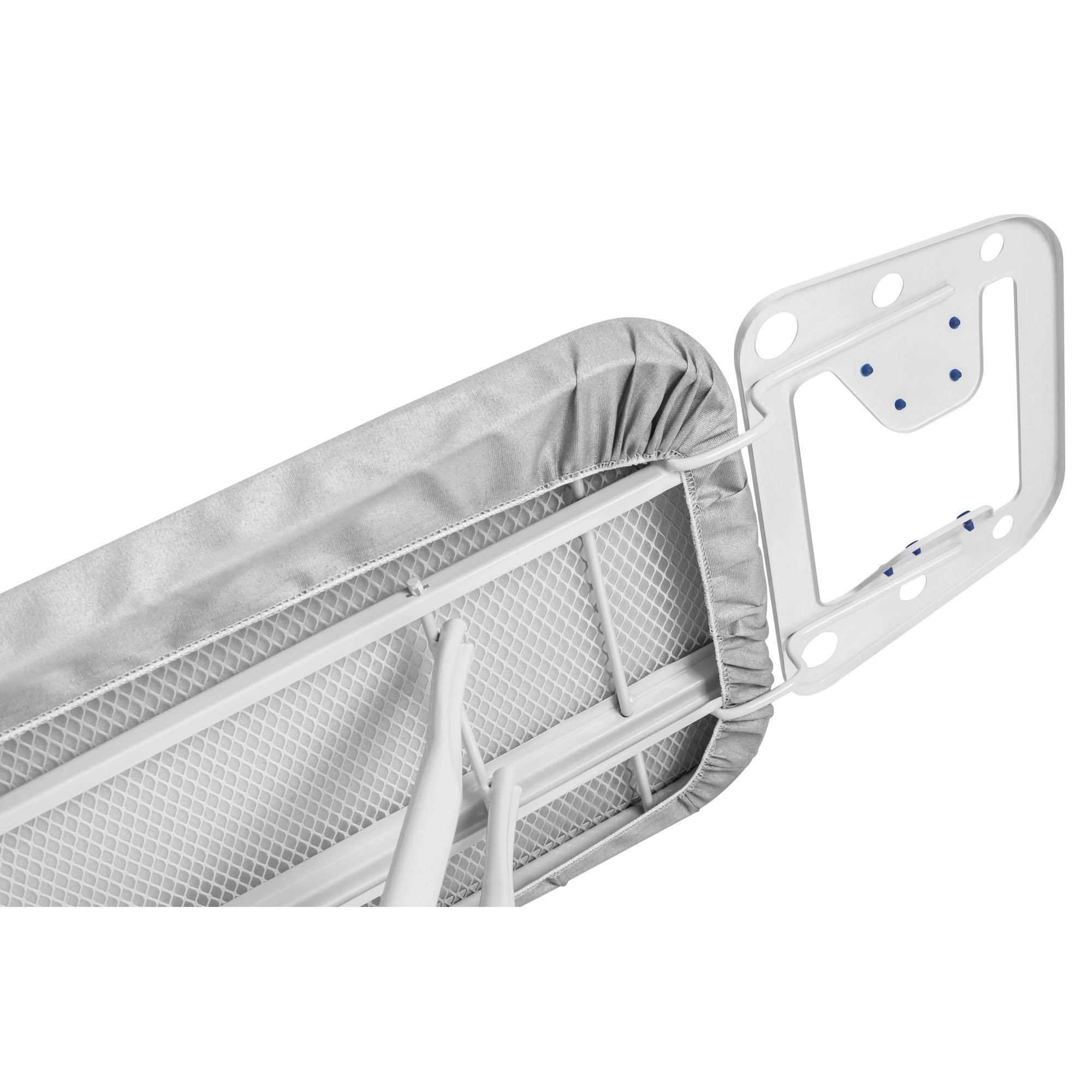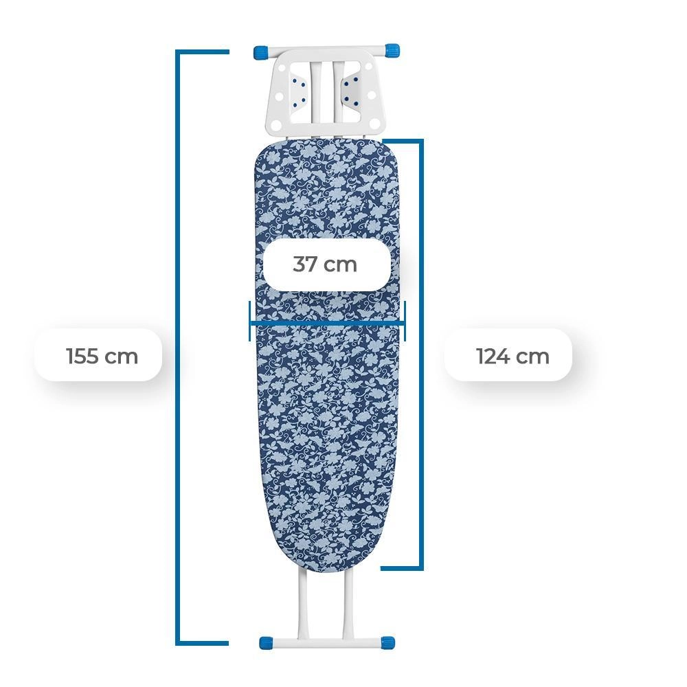Seu tampo em chapa de aço expandida minimizada, com furos de 6 mm x 3 mm, permite que o vapor do ferro passe facilmente pelas roupas, prevenindo o acúmulo de umidade, mofos e bactérias. Com dimensões de 124 x 37 cm, é uma mesa espaçosa e leve, perfeita para uso em diferentes espaços.