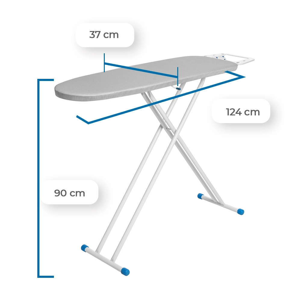 Seu tampo em chapa de aço expandida minimizada, com furos de 6 mm x 3 mm, permite que o vapor do ferro passe facilmente pelas roupas, prevenindo o acúmulo de umidade, mofos e bactérias. Com dimensões de 124 x 37 cm, é uma mesa espaçosa e leve, perfeita para uso em diferentes espaços.