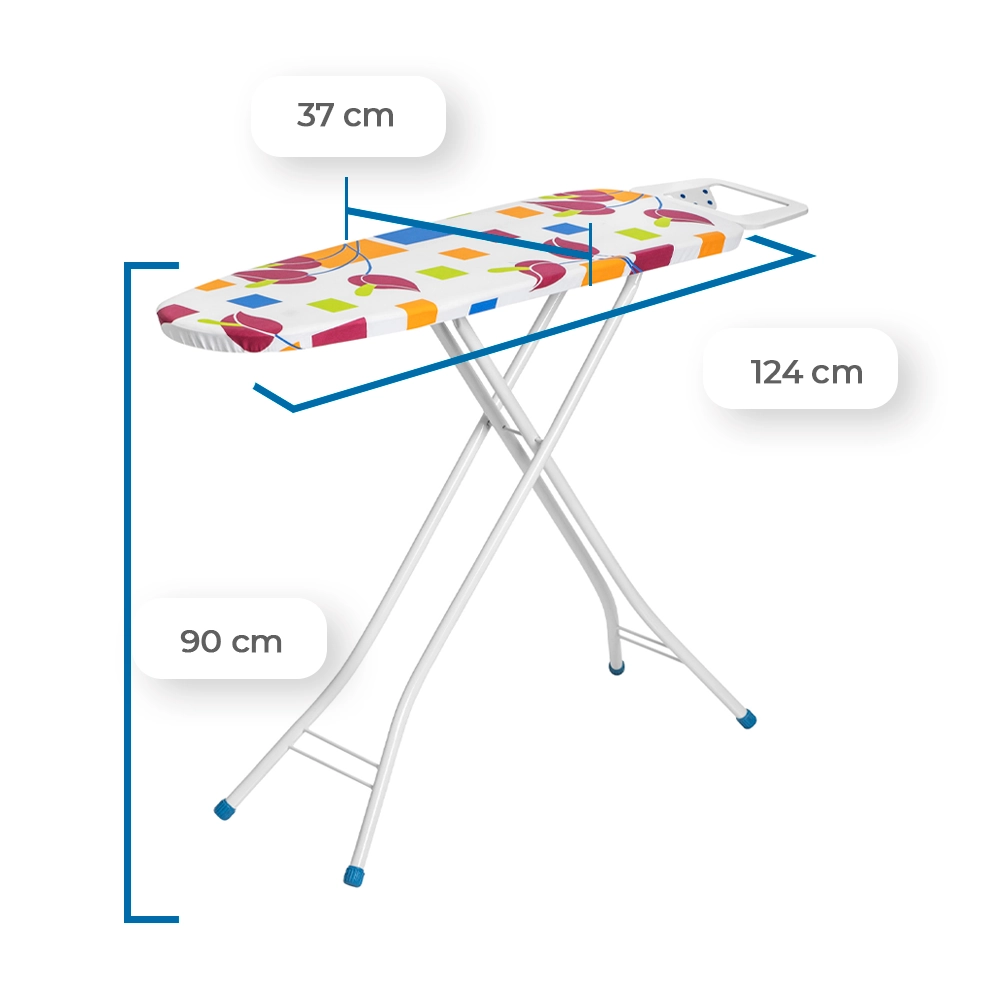 A espuma de poliuretano de 7 mm com densidade D16 oferece uma superfície macia para passar roupas, enquanto o forro estampado 100% algodão, resistente a altas temperaturas, otimiza o desempenho e evita a sensação escaldante, trazendo mais segurança e conforto.
