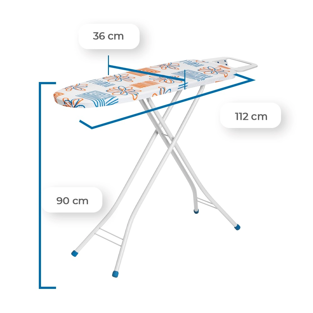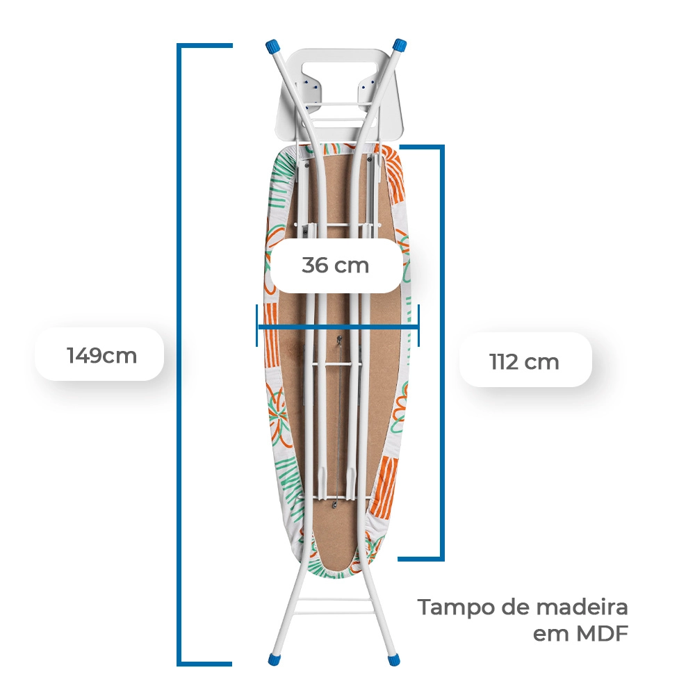 O tampo em madeira MDF, com dimensões de 112 x 36 cm, é liso, durável e livre de desníveis, garantindo uma superfície uniforme. A espuma de poliuretano de 7 mm com densidade D16 oferece maciez ao passar roupas, enquanto o forro estampado 100% algodão, resistente a altas temperaturas, reflete o calor, otimizando as tarefas e evitando a sensação escaldante.