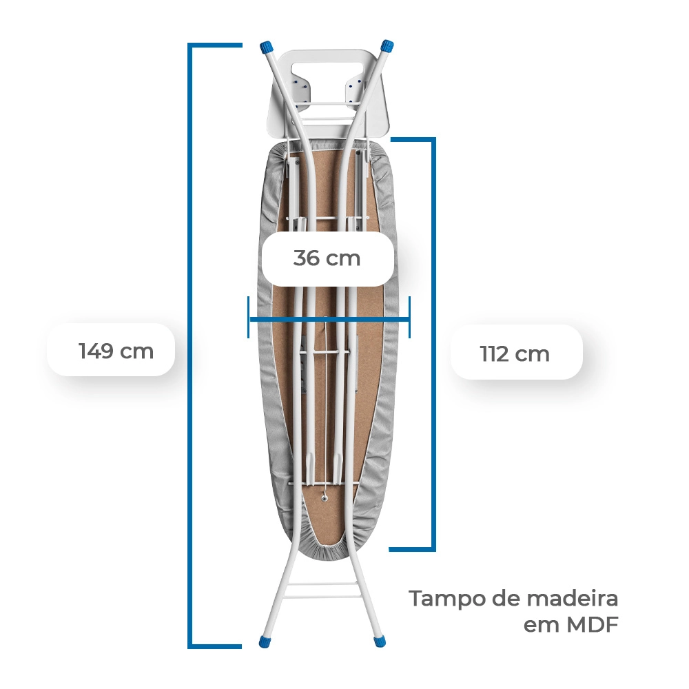 O tampo em madeira MDF, com dimensões de 112 x 36 cm, é liso, durável e livre de desníveis, garantindo uma superfície uniforme. A espuma de poliuretano de 7 mm com densidade D16 oferece maciez ao passar roupas, enquanto o forro metalizado 100% algodão, resistente a altas temperaturas, reflete o calor, otimizando as tarefas e evitando a sensação escaldante.