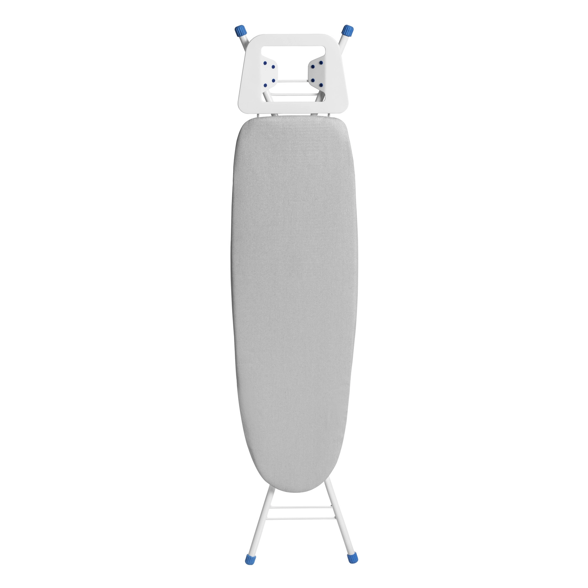O suporte para ferro, com 8 pontas de silicone, inclinado em duas posições, é ideal para manusear o ferro com segurança, mesmo quando quente. Para maior estabilidade, a tábua conta com ponteiras antiderrapantes em PVC nos pés, garantindo segurança e firmeza durante o uso.