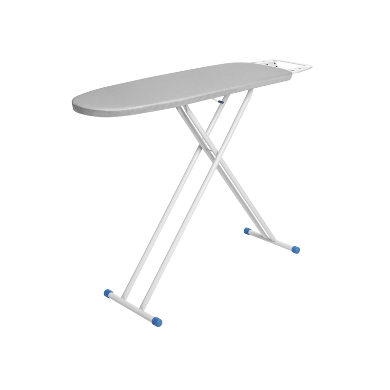O suporte para ferro, com 8 pontas de silicone, é inclinado em duas posições, garantindo segurança mesmo com o ferro quente. Também inclui suporte para cabides, facilitando a organização. As ponteiras antiderrapantes em PVC nos pés conferem estabilidade ao produto, garantindo maior conforto e segurança durante o uso.