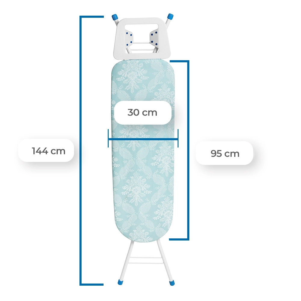 O destaque deste modelo é o tampo em chapa de aço expandida minimizada, que utiliza pequenos furos de 6 mm x 3 mm. Essa tecnologia permite que o vapor penetre e saia da roupa com facilidade, evitando a imobilização do vapor, reduzindo significativamente o surgimento de mofos e bactérias, e otimizando a tarefa de passar roupas. Com dimensões de 95 x 30 cm, é um modelo leve e fácil de transportar, ideal para ambientes compactos.